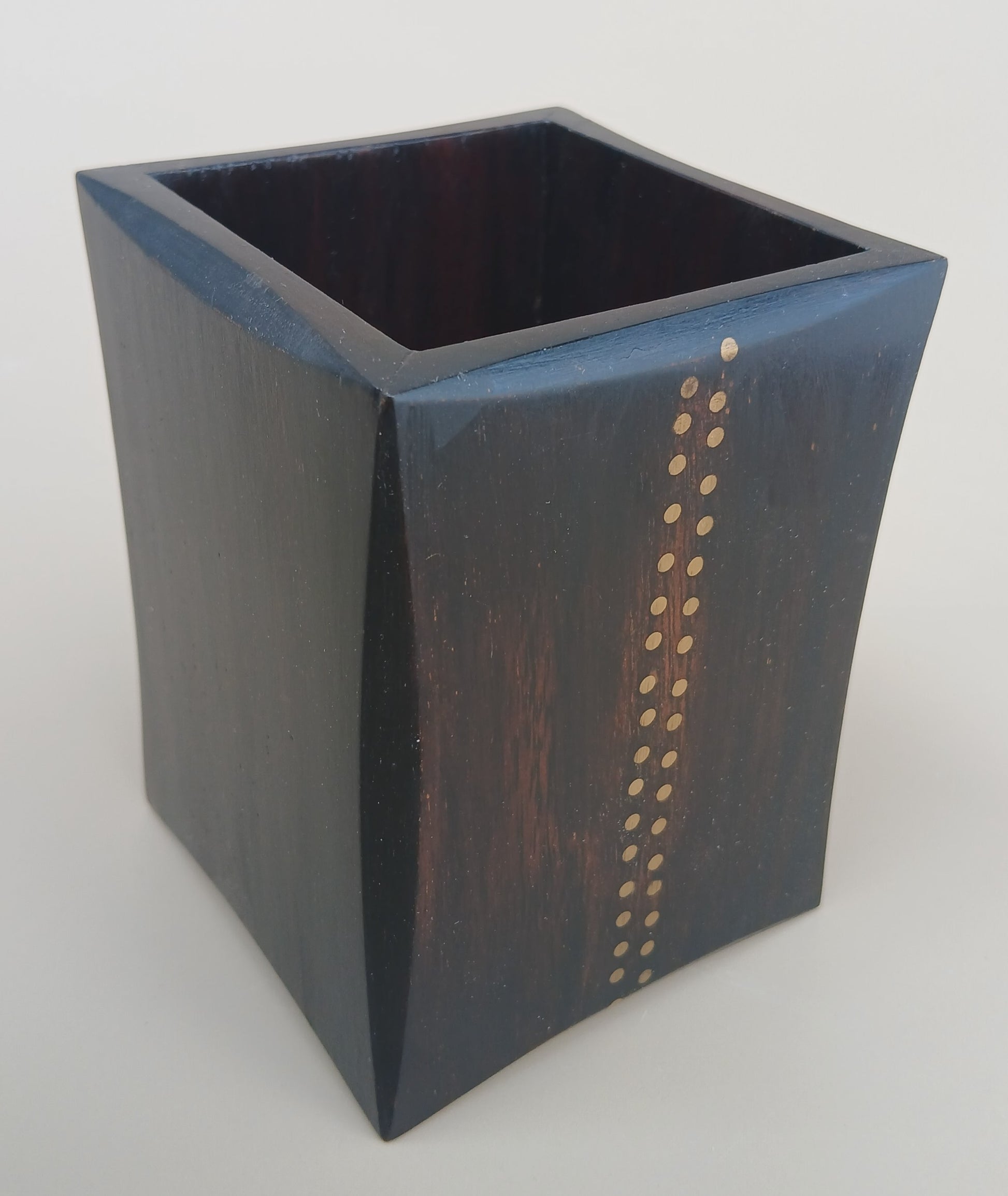 Handcrafted from Sheesham wood, this elegant cutlery holder features a minimalistic design with a refined vertical inlay of cross-sectioned brass wire. This piece is a contemporary take on the traditional Tarkashi craft, making it both functional and visually striking..