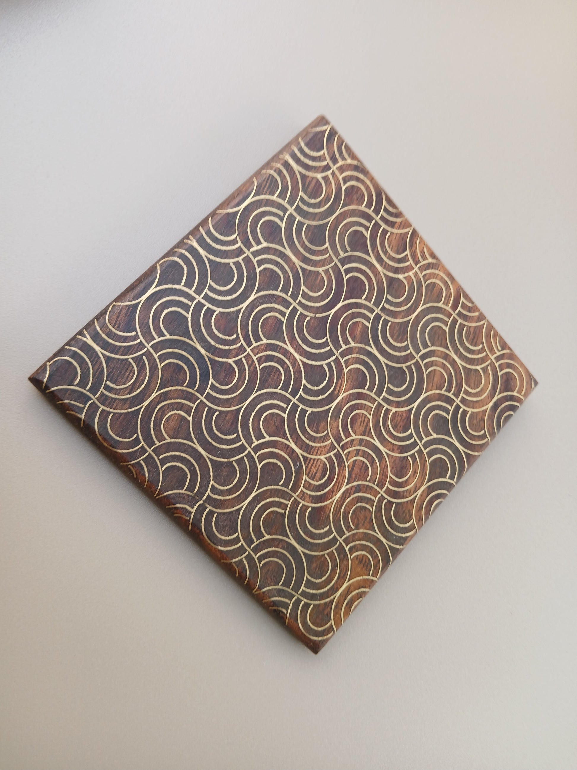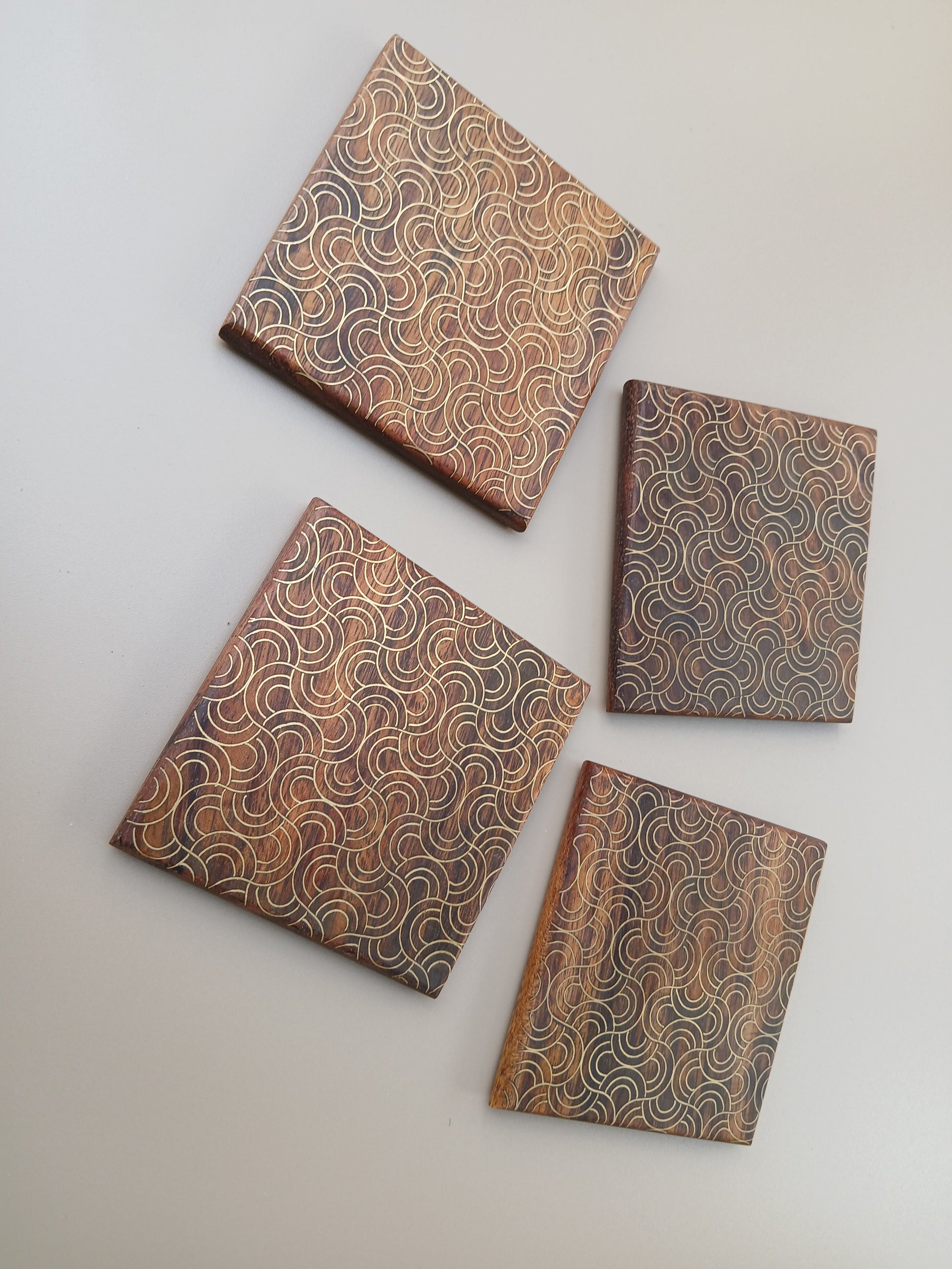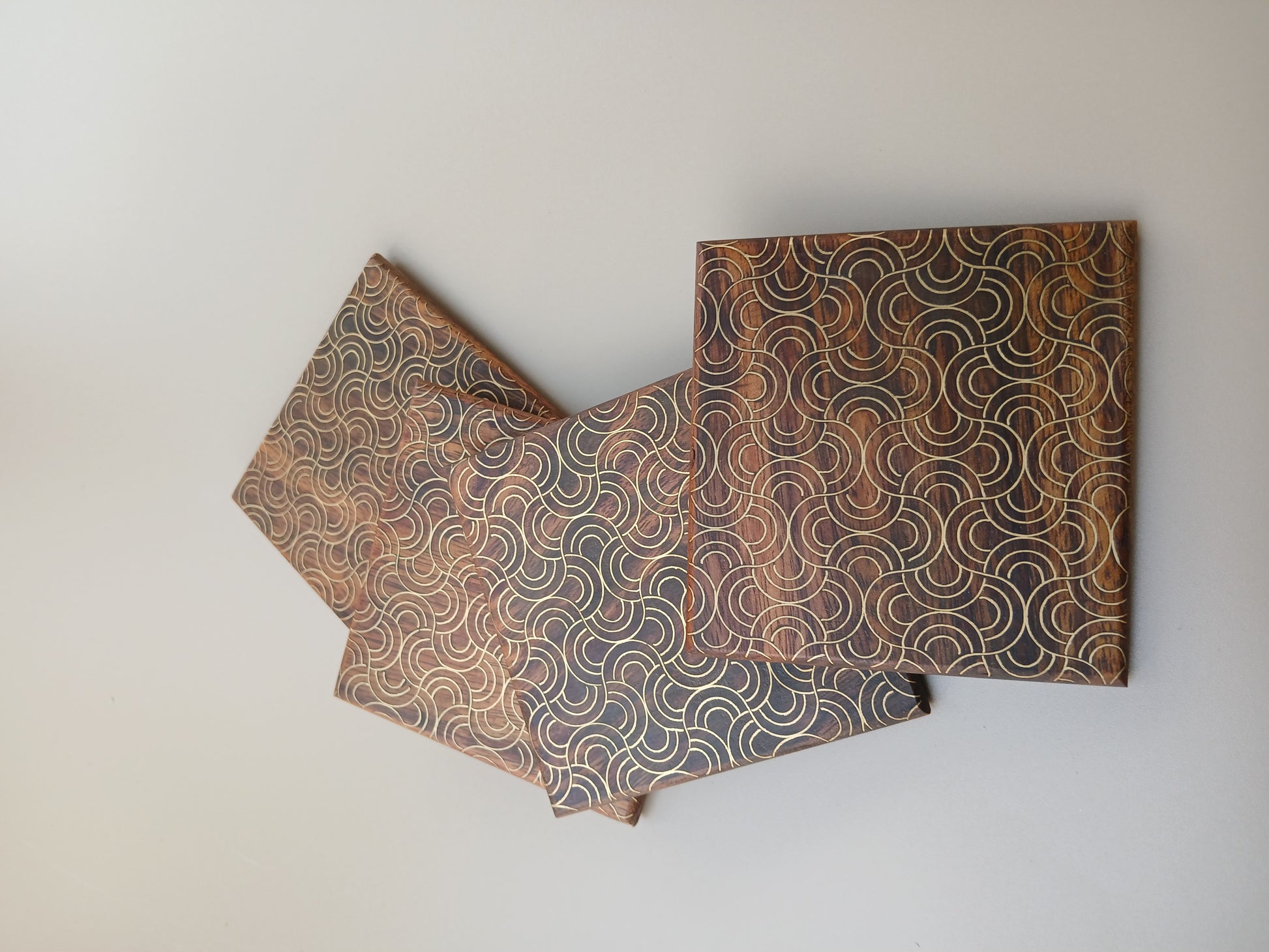 This beautifully crafted Tarkashi coasters feature a mesmerising semi-circular tessellation pattern, carefully inlaid with fine brass wire by skilled artisans of Saharanpur. Each curve and contour is hand-rendered onto richly grained Siris wood, celebrating the traditional art of brass inlay with a contemporary design twist.